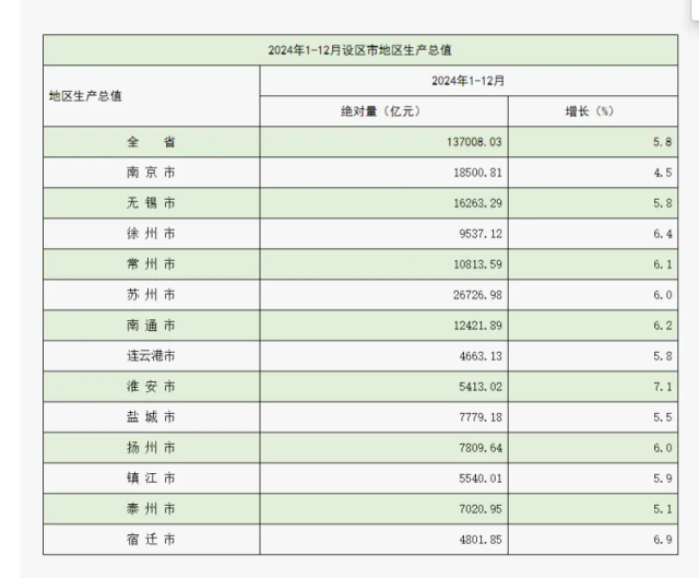 2024年江苏13个设区市地区生产总值(GDP)数据 图源:江苏省统计局